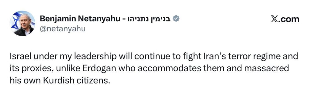 Netenyahû di parvekirina xwe de got: Di bin serokatiya min de, Îsraîl dê şerê rejîma terorîst a Îranê û alîgirên wê bidomîne; berevajî Erdogan, ku çavên xwe ji wan digire û welatiyên xwe yên Kurd dikuje.