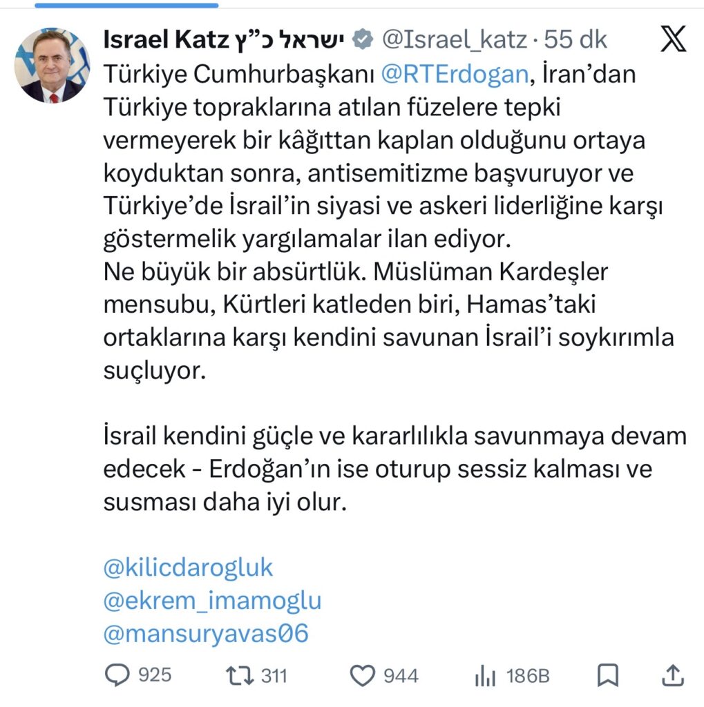 Ji aliyê din ve, Wezîrê Parastinê yê Îsraîlê Îsraîl Katz jî postek berê bi Îbranî û dû re jî bi Tirkî nivîsand û wiha got: